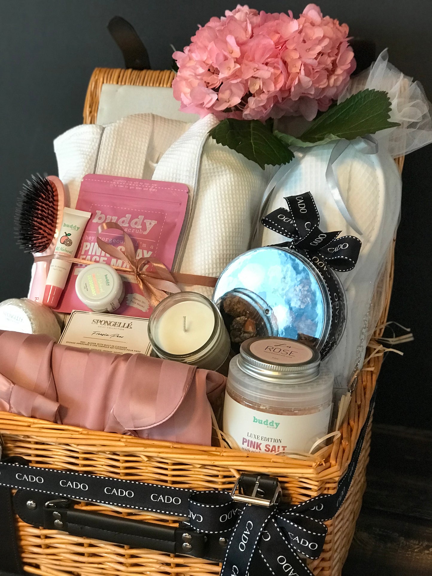 Don a beautifully crafted waffle robe and slippers, light a rose-scented candle, and indulge in an assortment of Arabic dates. Along with a pink clay face mask, grapefruit lip scrub, pink salt body scrub, natural fiber hairbrush, all-natural deodorant and spongelle fressia pear body wash and Pedi buffer.
