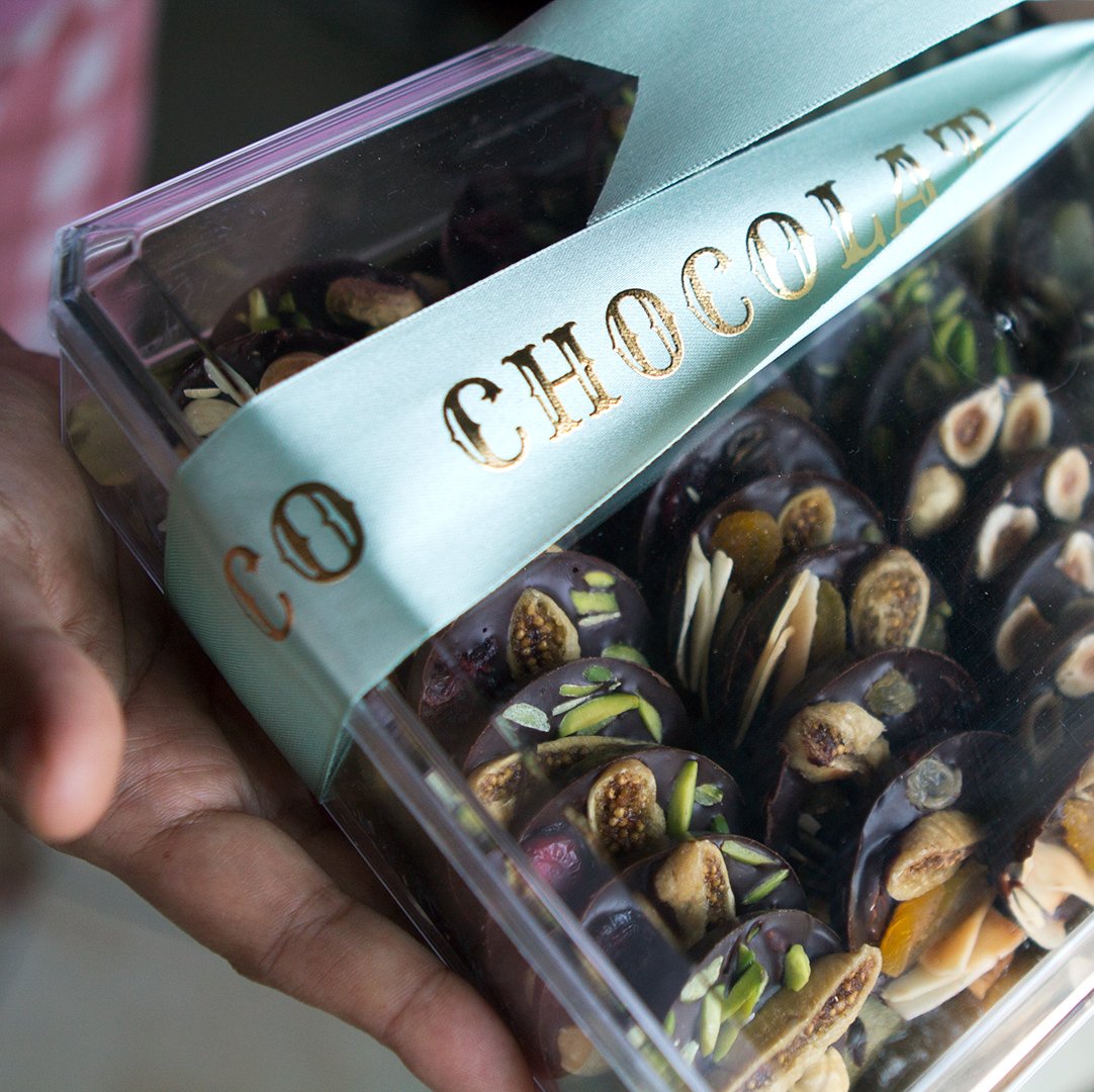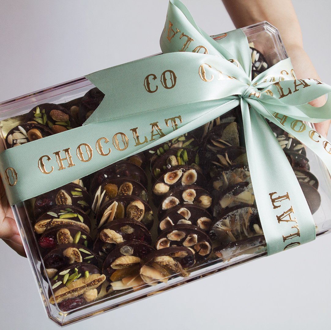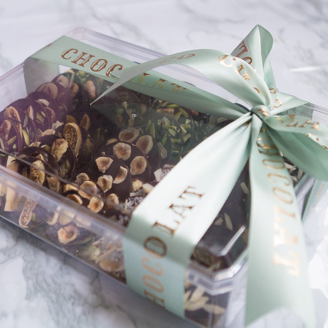 Delicious 60% dark chocolate flavors “High on Happy” and “That Skinny” are the base for the mendiant that is sweetened with the mega-, superfood dates, and a dash of coconut sugar. No palm oil, no emulsifiers, perfect to serve fit-foodie guests and loved ones because there is something for everyone!