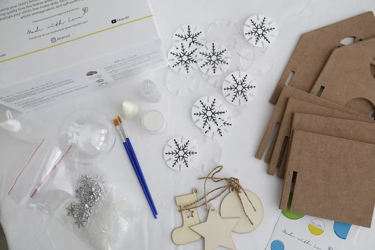 Sensory Globe: stick the tree onto the cover of the globe, then fill the globe with your choice of sensory stimulating items included in the kit: snowflakes, glitter, a bit of glue and water (not included) to create your own sensory snow globe. (skills: Sensory development, calm down and self-soothing skills)