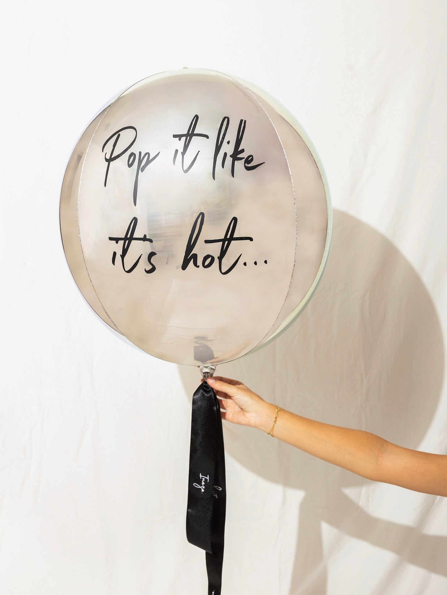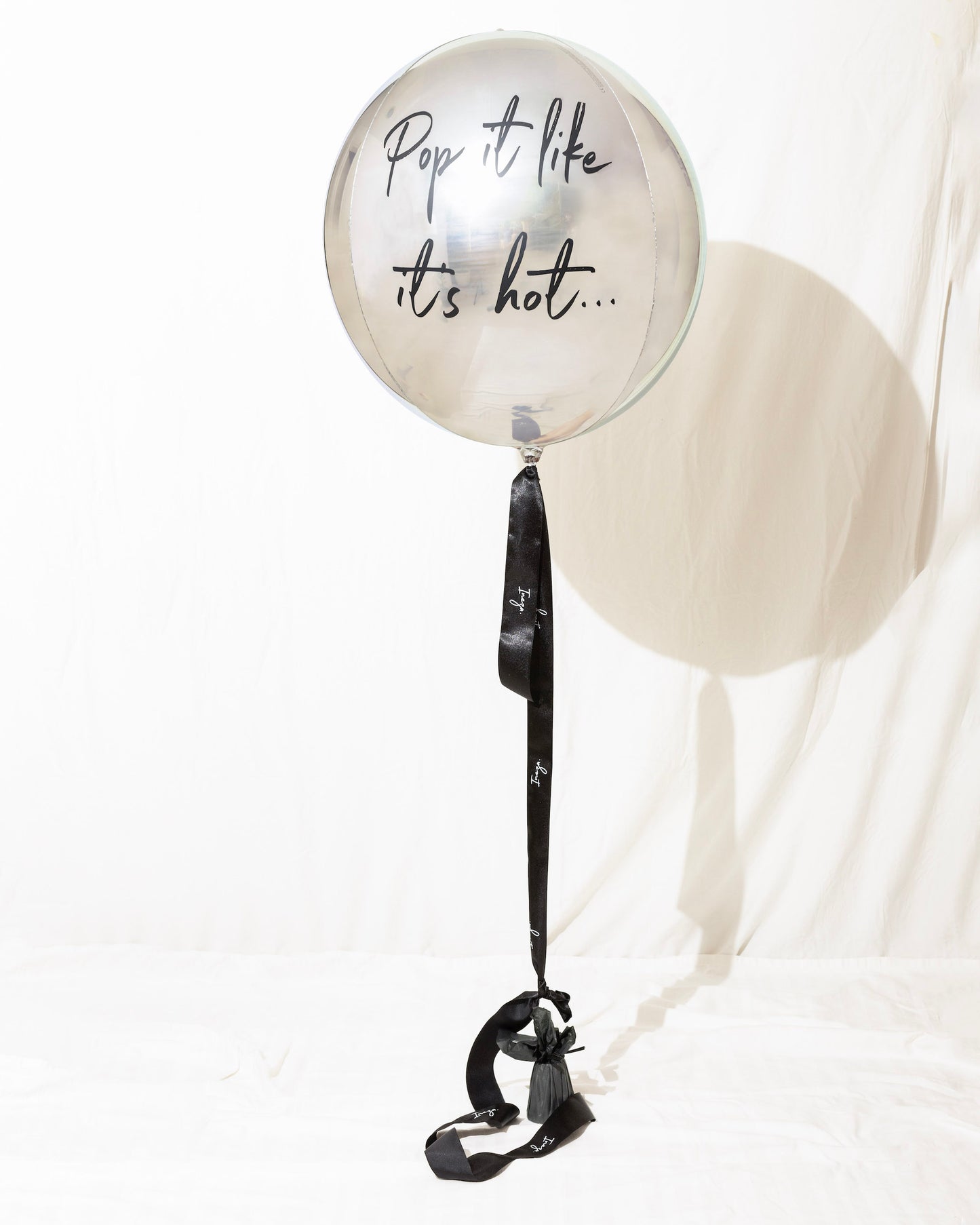 These foil giant orbs are 3ft in size and are available in two colors with the tail being made of silk ribbon, Ineza bow, and with a black weight.