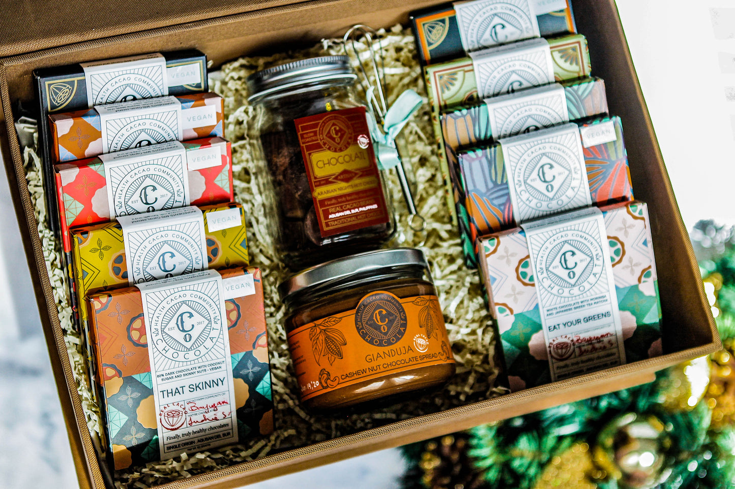 A great gift for the chocolate lover, packed in a large gift box filled with 10 Chocolate Bars in assorted flavors, a jar of Gianduja spread, and a 250gr Jar of Hot Chocolatl.