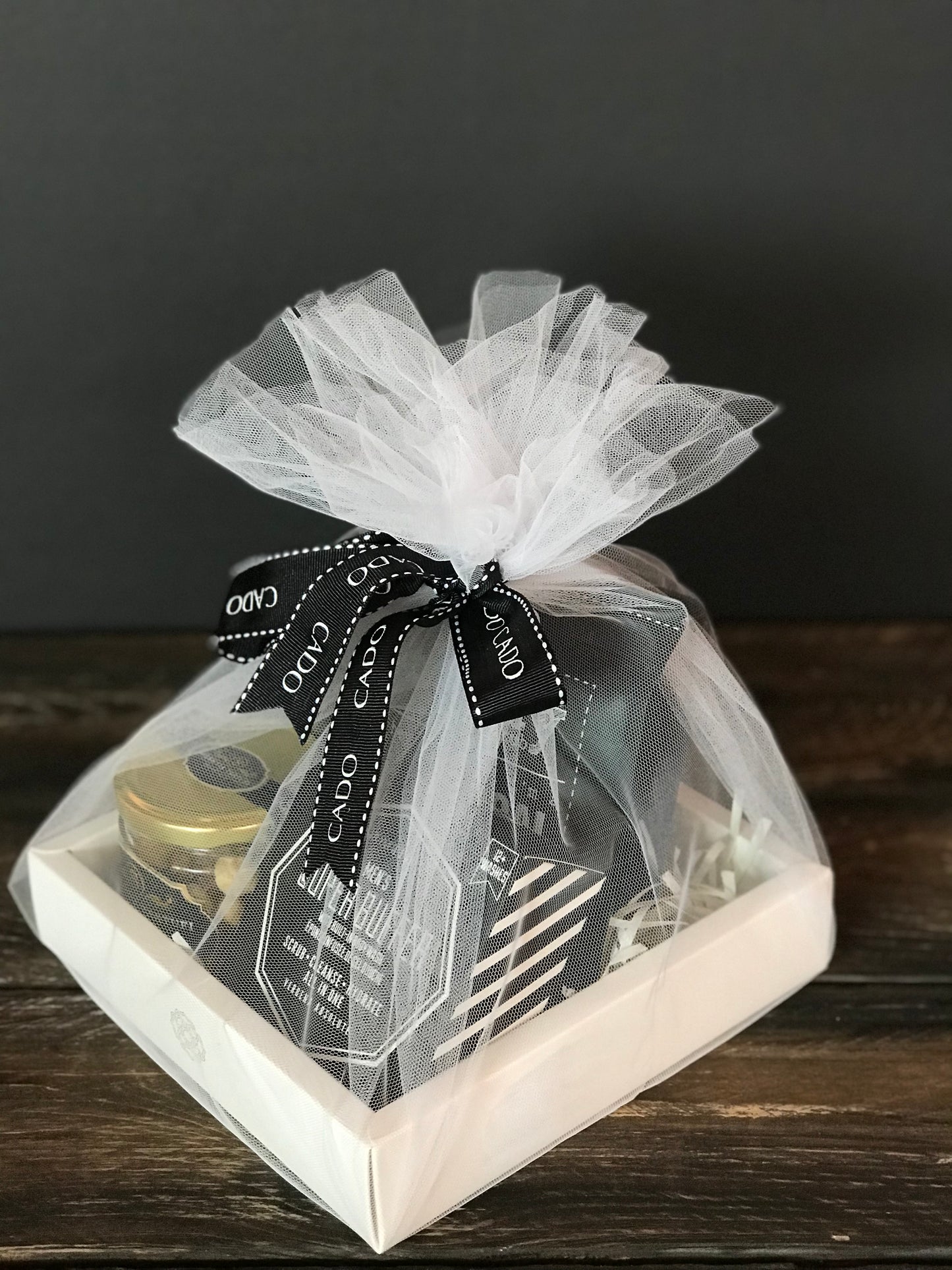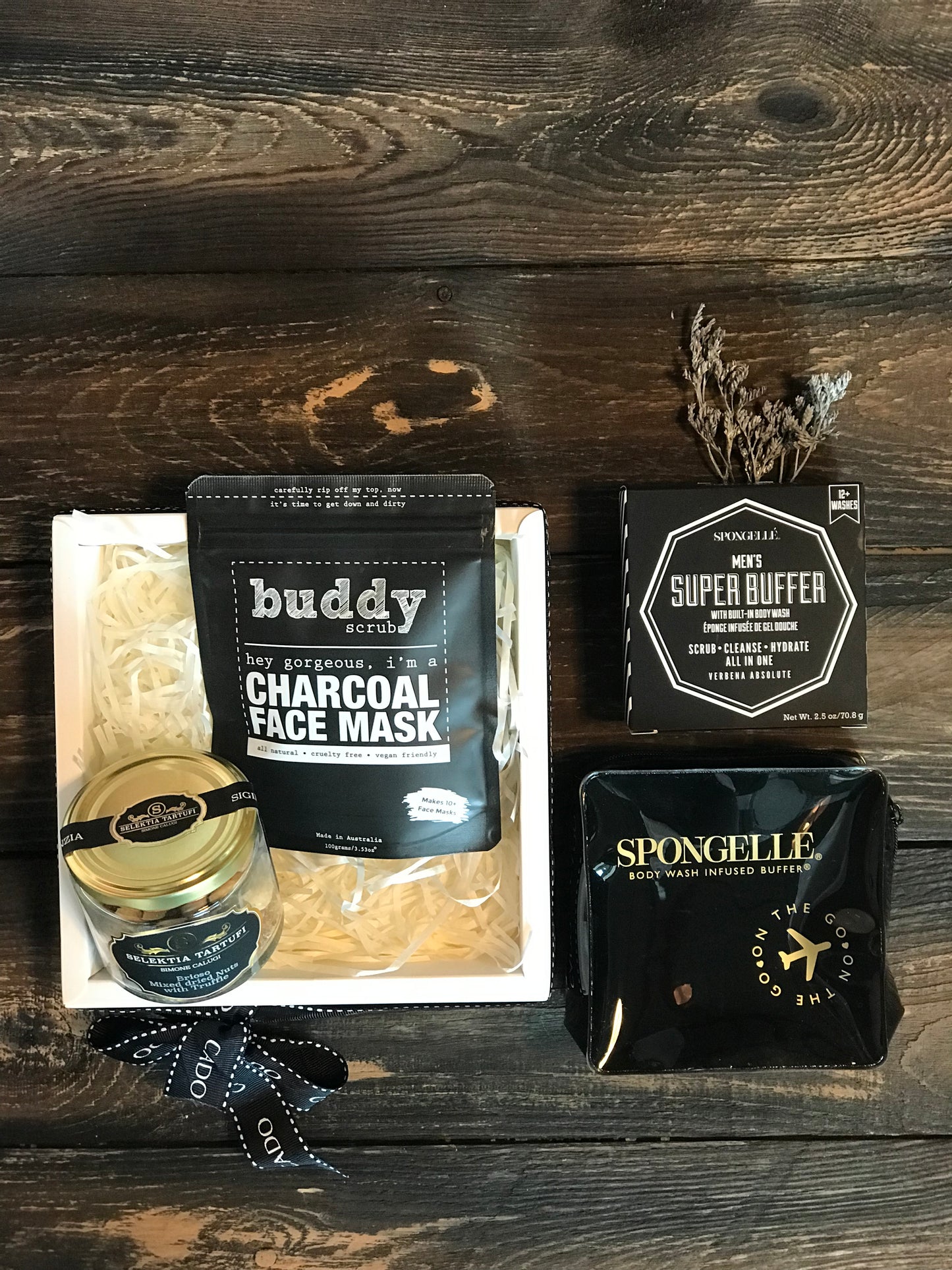 Enjoy a purifying charcoal face mask, Spongelle super buffer body scrub and travel bag, while indulging on delectable truffle mixed nuts.