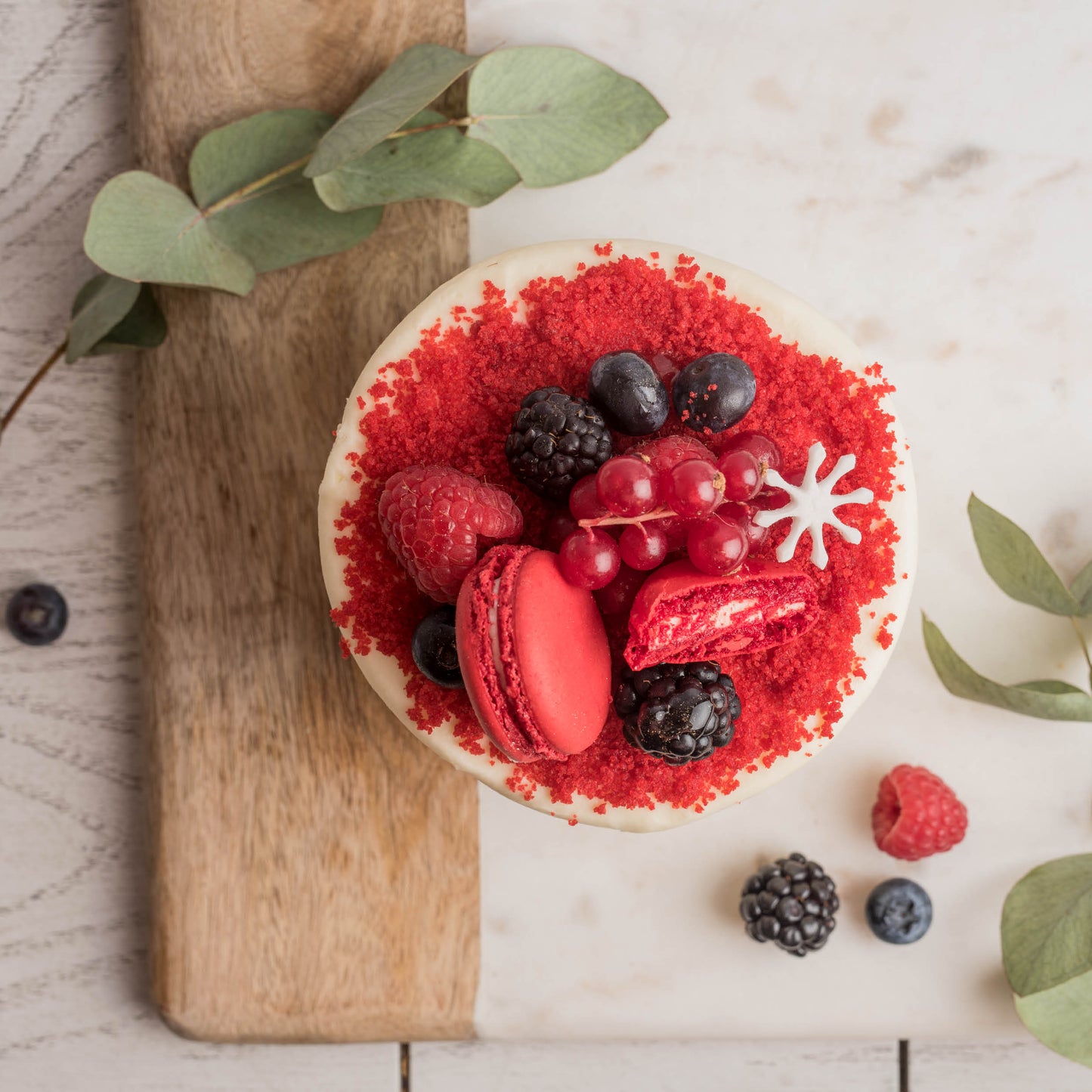 A classic cake made with soft red velvet sponge with cream cheese frosting and topped with fresh berries.