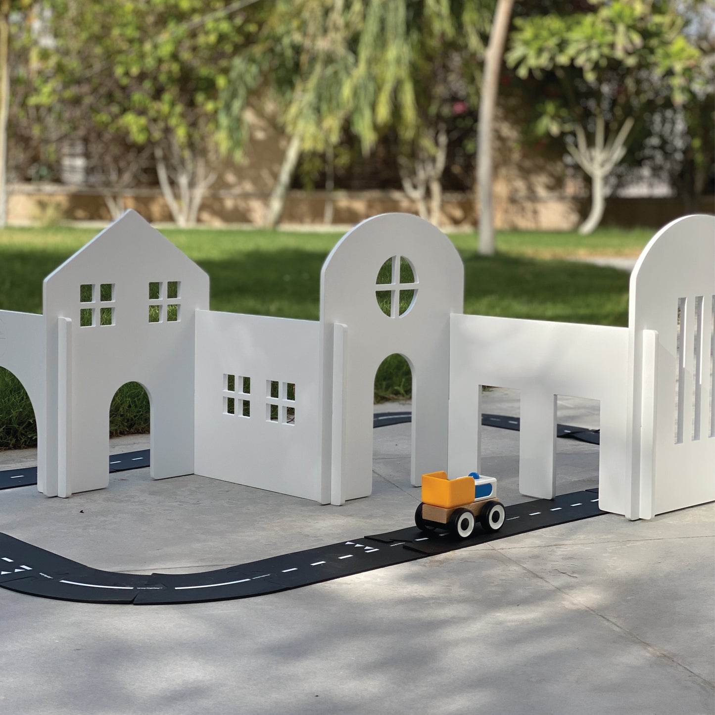 8 interlocking house elevations that slot together to create the skyline of your imagination (a building, a cityscape, an open plan, a town and many more) Ages 3+