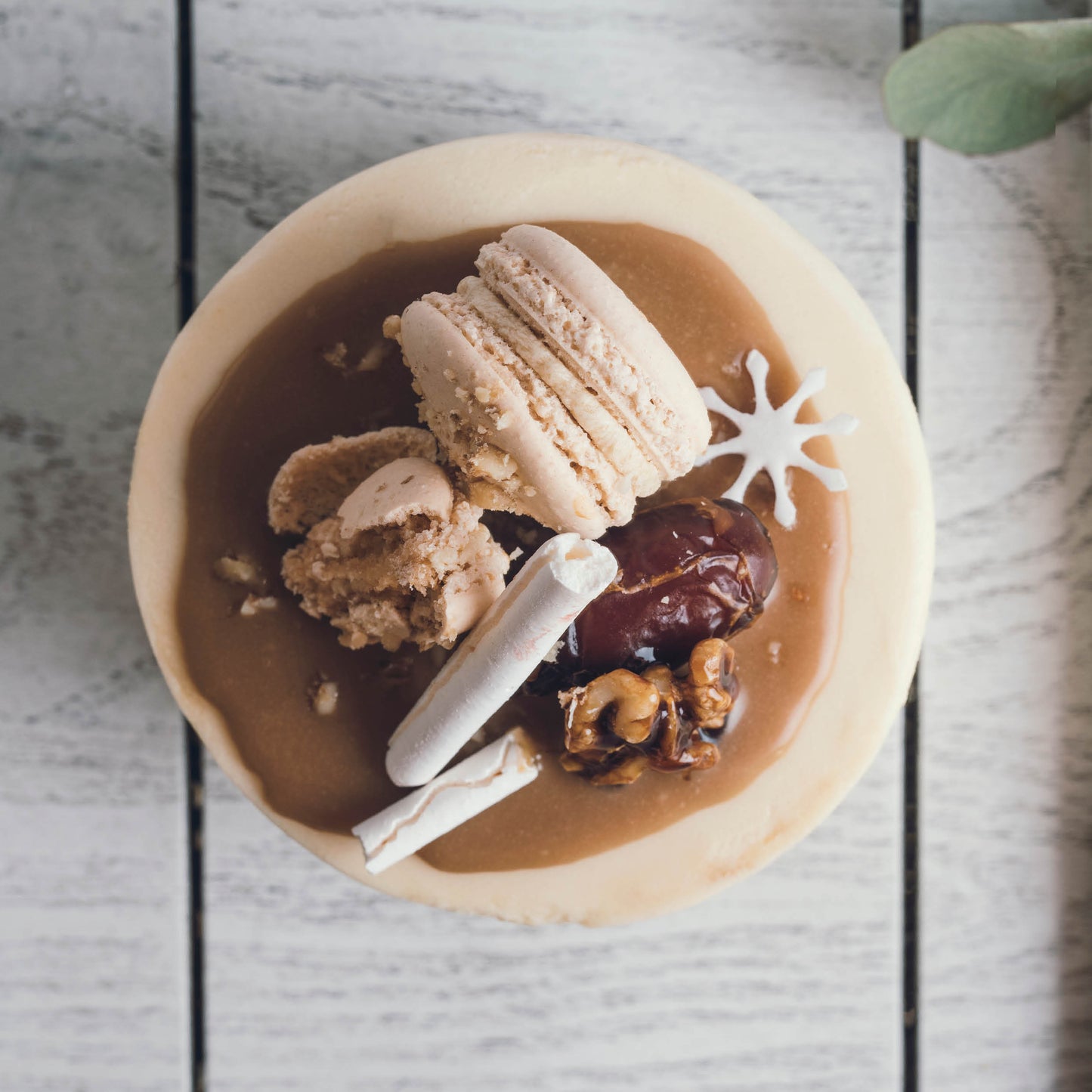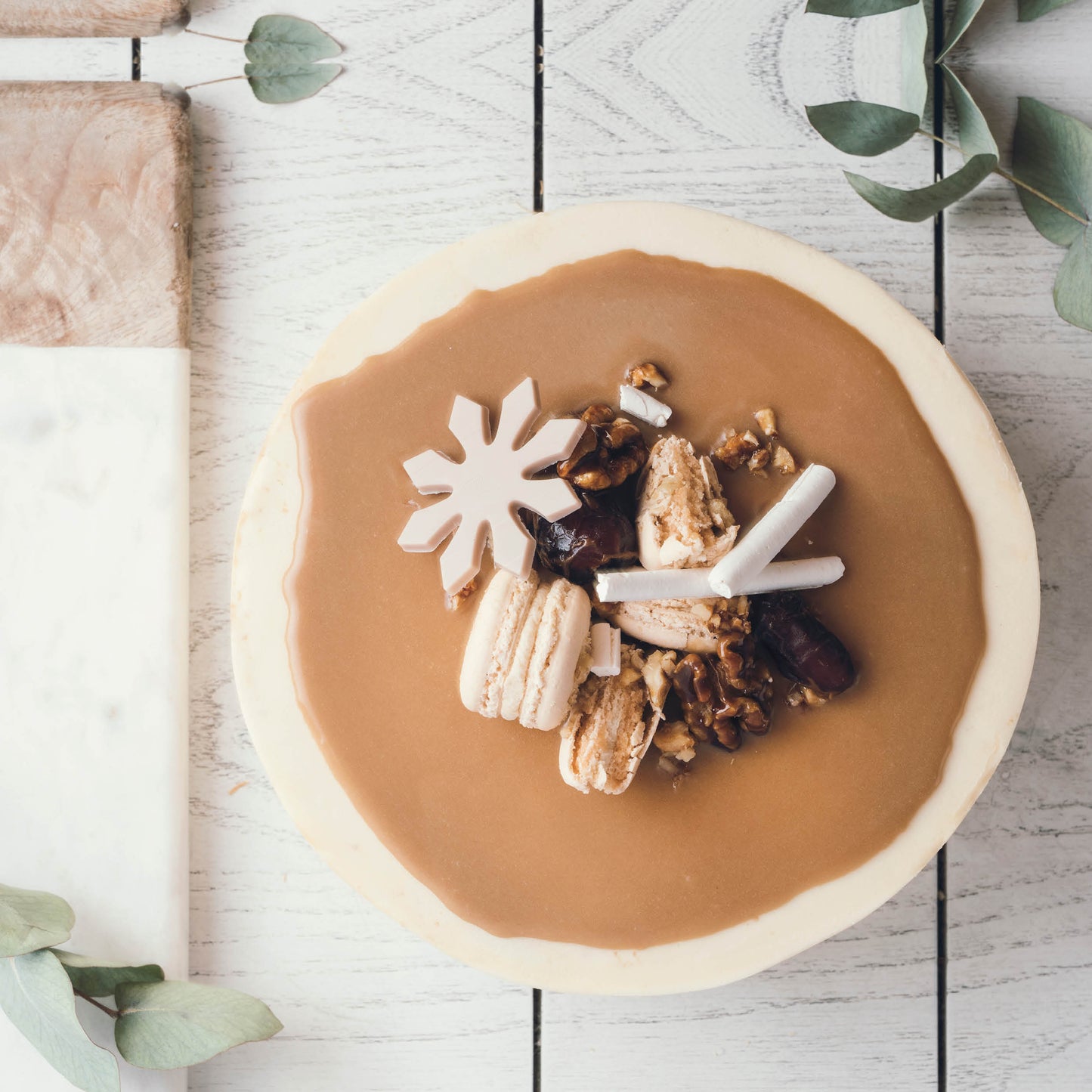 Sweet and sticky, this toffee and date cake is coated in caramel butter cream and topped with broken chocolate toffee, dates and mini marshmallows.